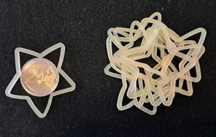 Diese Gummiringe, die die Form eines Sterns annehmen, sind größer als die farbigen Gummiringe, die wir ebenfalls anbieten.